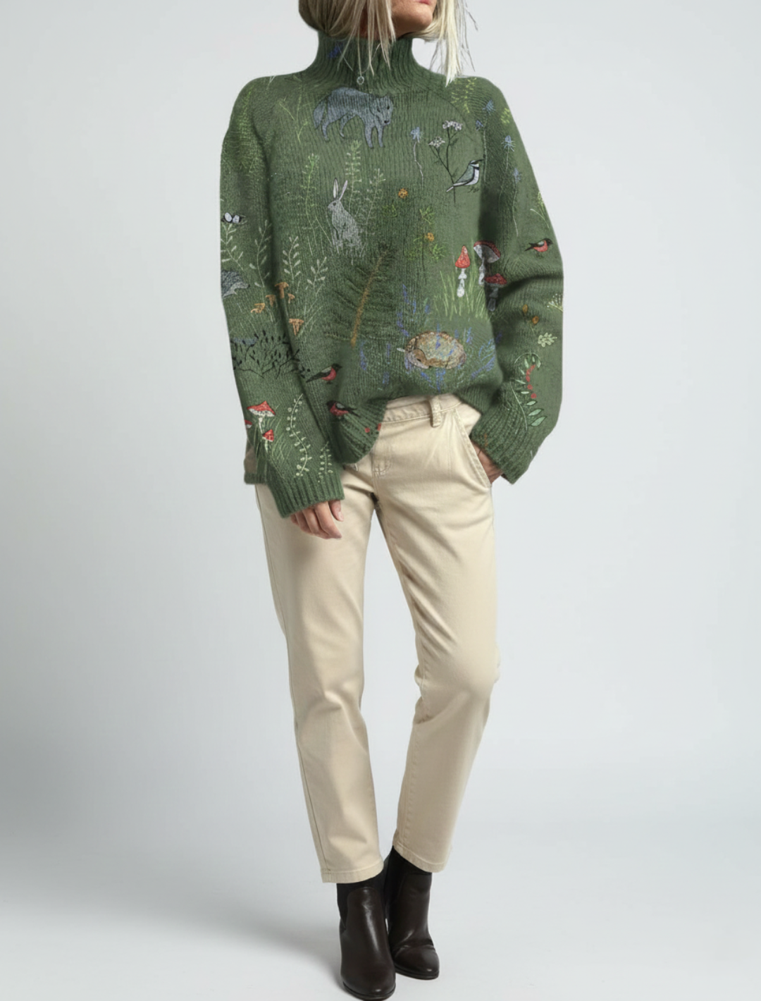 Sweter Anna Ciepły i Elegancki z Golfem łączy vintage'owy urok z przytulną elegancją. Posiada miękki, wysoki kołnierz i misterny kwiatowy wzór, oferując zarówno ciepło, jak i wyrafinowany styl. Jego luźna sylwetka sprawia, że jest niezwykle korzystny i łatwy do zestawienia z spodniami, spódnicami lub dżinsami, tworząc szykowny zimowy wygląd.
