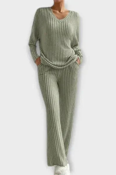 Sada s dlouhým V-výstřihem a širokými kalhotami je ideální pro pohodové chvíle doma nebo pro vytvoření bezstarostného a stylového vzhledu během vašich výletů.