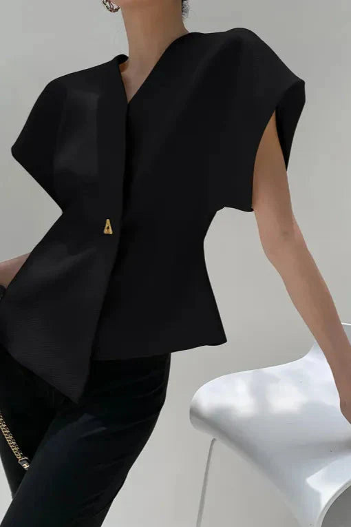Architettonico nel taglio – questo top scultoreo avvolgente combina strutture marcate con un'eleganza fluida. Il punto focale è una semplice chiusura in metallo, che mette in risalto la vita con un focus consapevole.
