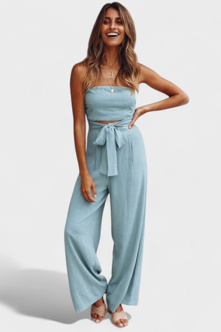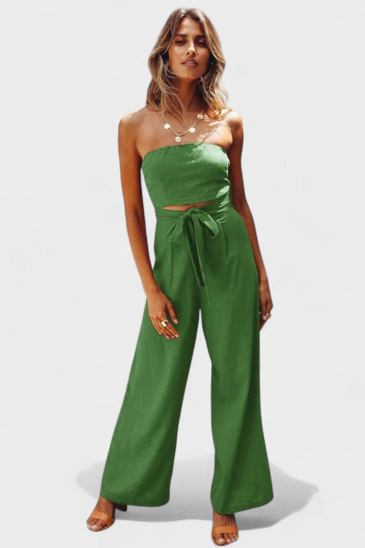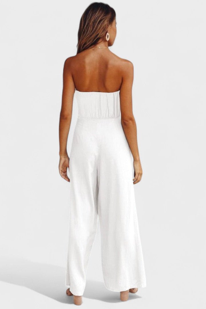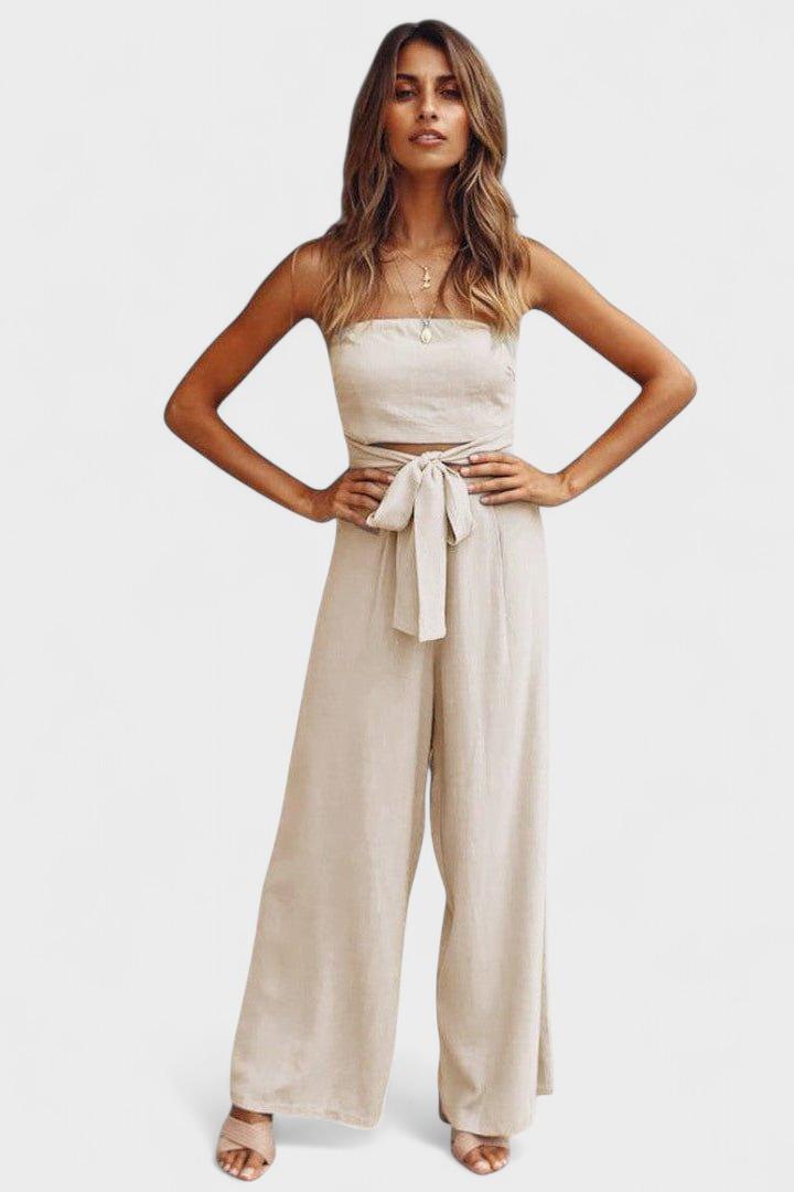Tento moderní overal dokonale spojuje jednoduchost a sofistikovanost. Díky svému ženskému bezramennému střihu, pásku, který zvýrazňuje pas, a širokým, vzdušným nohavicím nabízí pohodlí a stylovost v každé situaci – ať už jde o městskou procházku, večerní akci nebo zvláštní příležitost.
