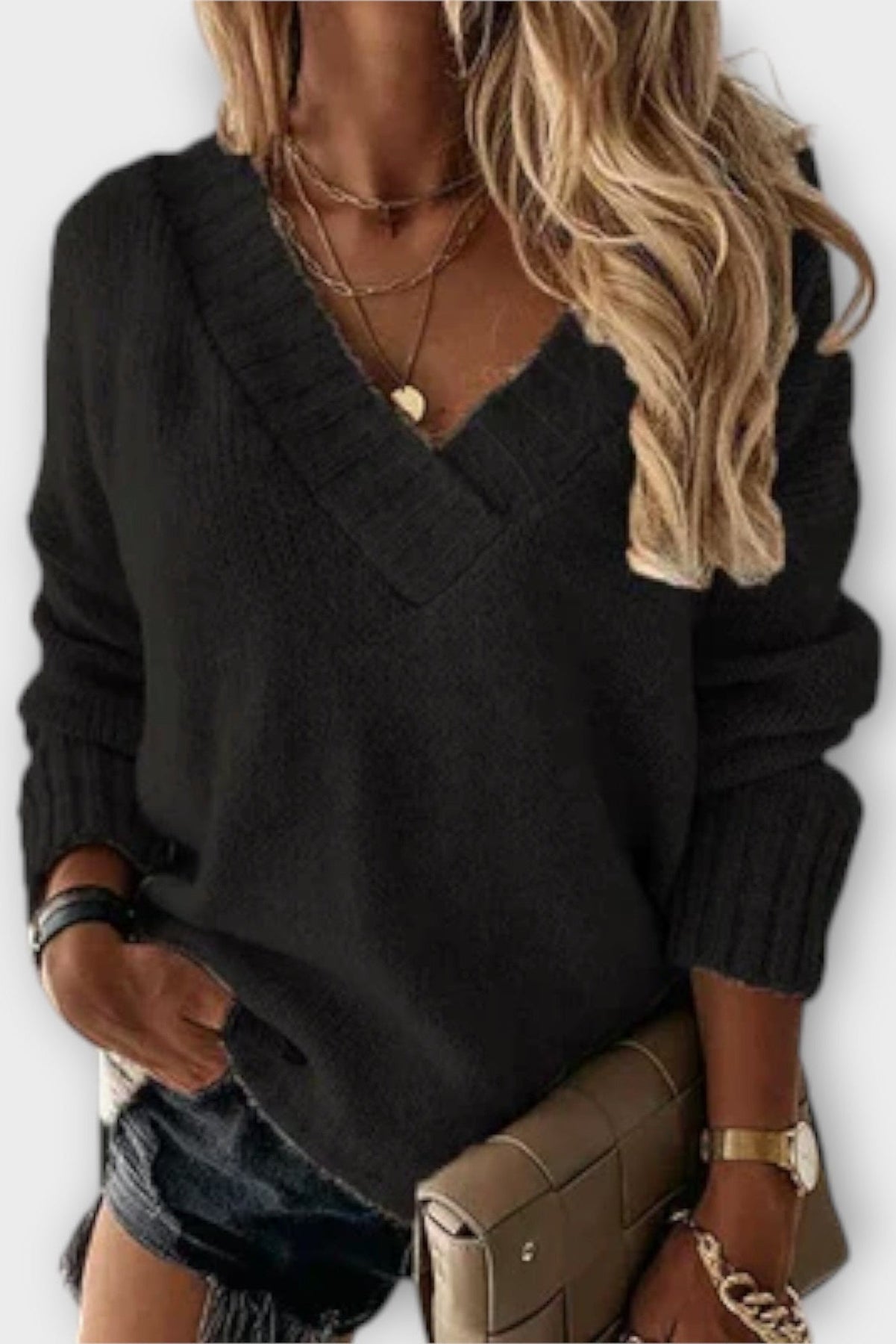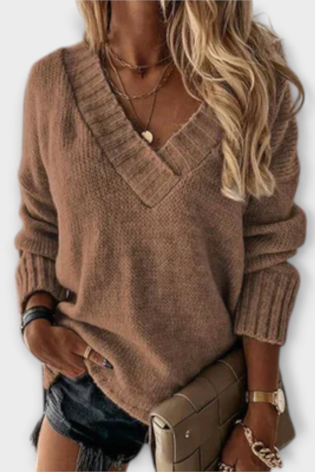 Znajdź idealnego towarzysza na chłodne dni! Wygodny damski sweter z kobiecym dekoltem w kształcie V łączy ponadczasową elegancję z maksymalnym komfortem, pozwalając Ci poruszać się stylowo i wygodnie jesienią i zimą.