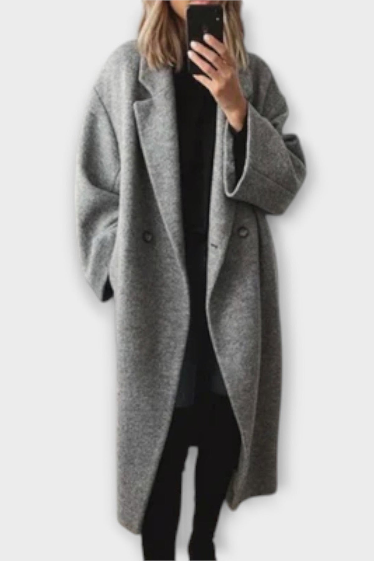 Stylowy długi płaszcz z szerokim kołnierzem łączy elegancję z praktycznością. Luksusowy materiał chroni przed zimnem, a klasyczny design sprawia, że jest idealny na każdą okazję.
