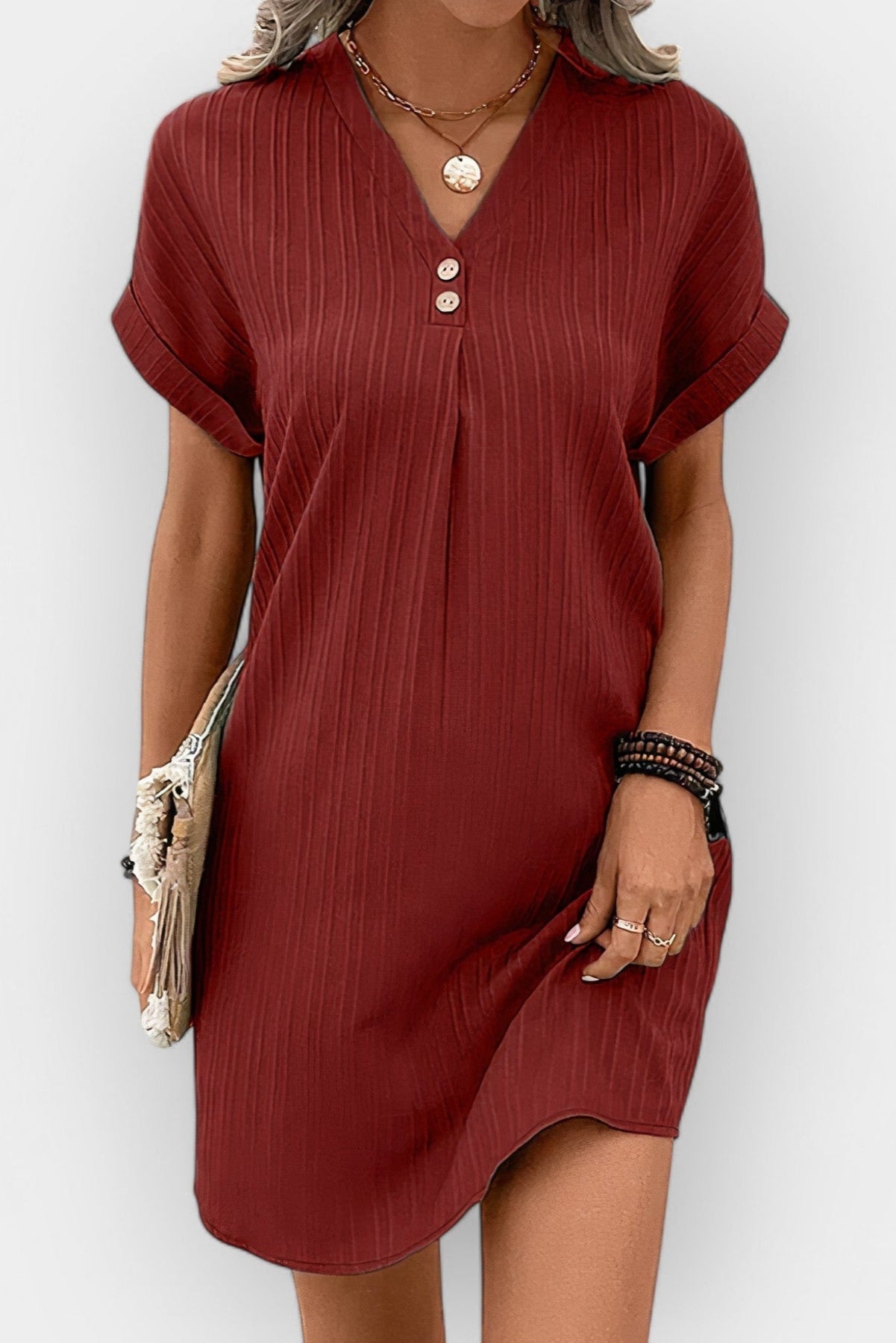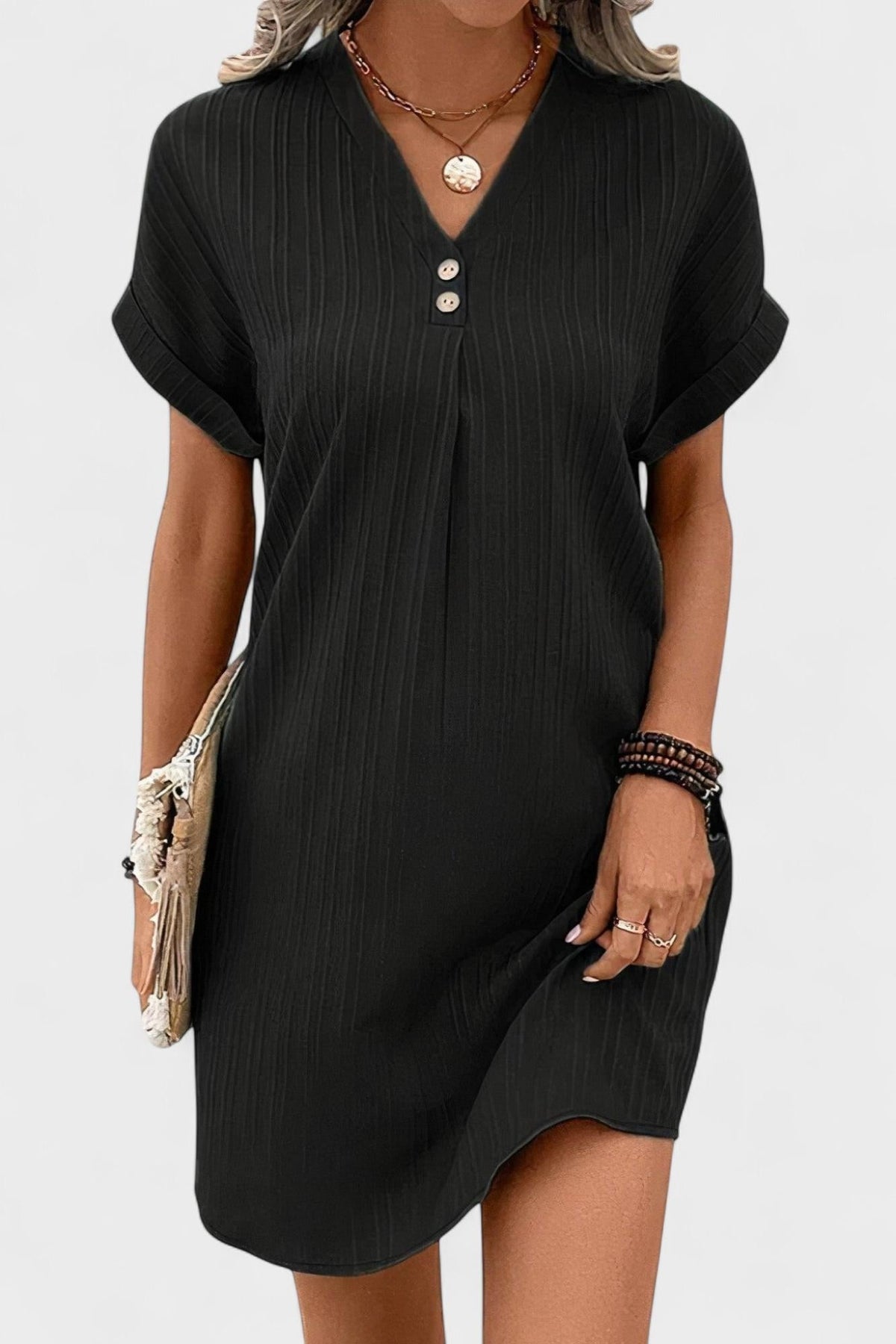 Oslnivé a stylové šaty, ideální pro každou letní příležitost. V-výstřih a volný střih dodávají ženskost a pohodlí při každém kroku.