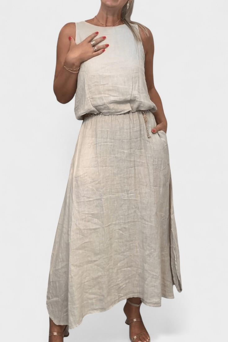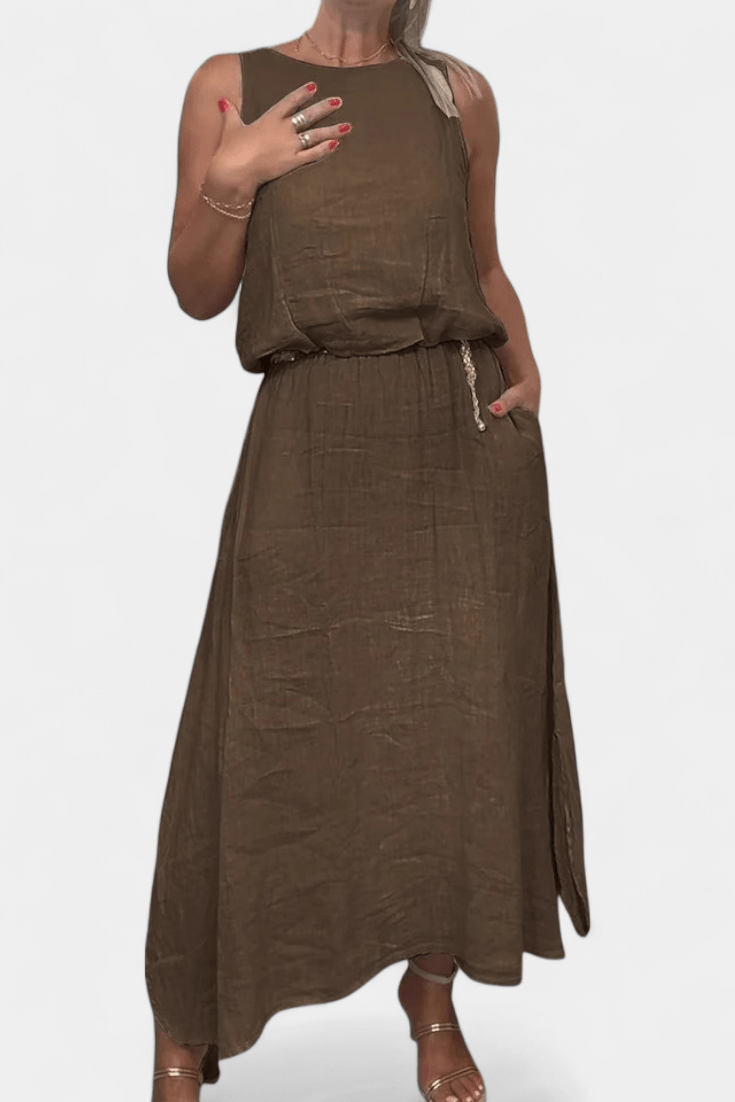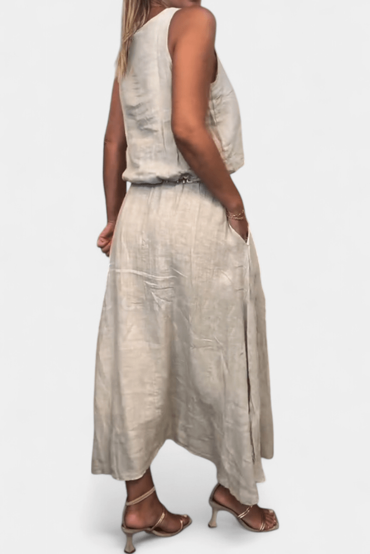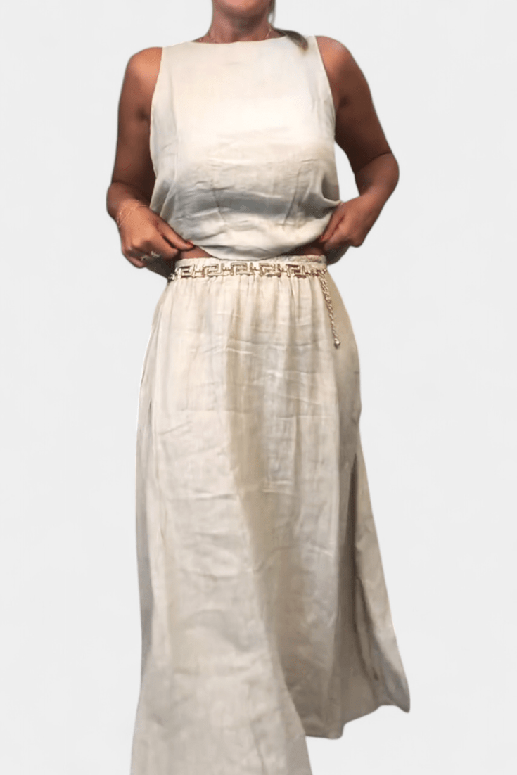 Přirozené, svěží a minimalistické. Sada Meliora spojuje esenci léta s uvolněným a sofistikovaným střihem. Sada obsahuje bezrukávový kabátek s volným střihem a dlouhou sukni se bočními kapsami. Kombinace lnu a bavlny vyzařuje eleganci při každém kroku.
