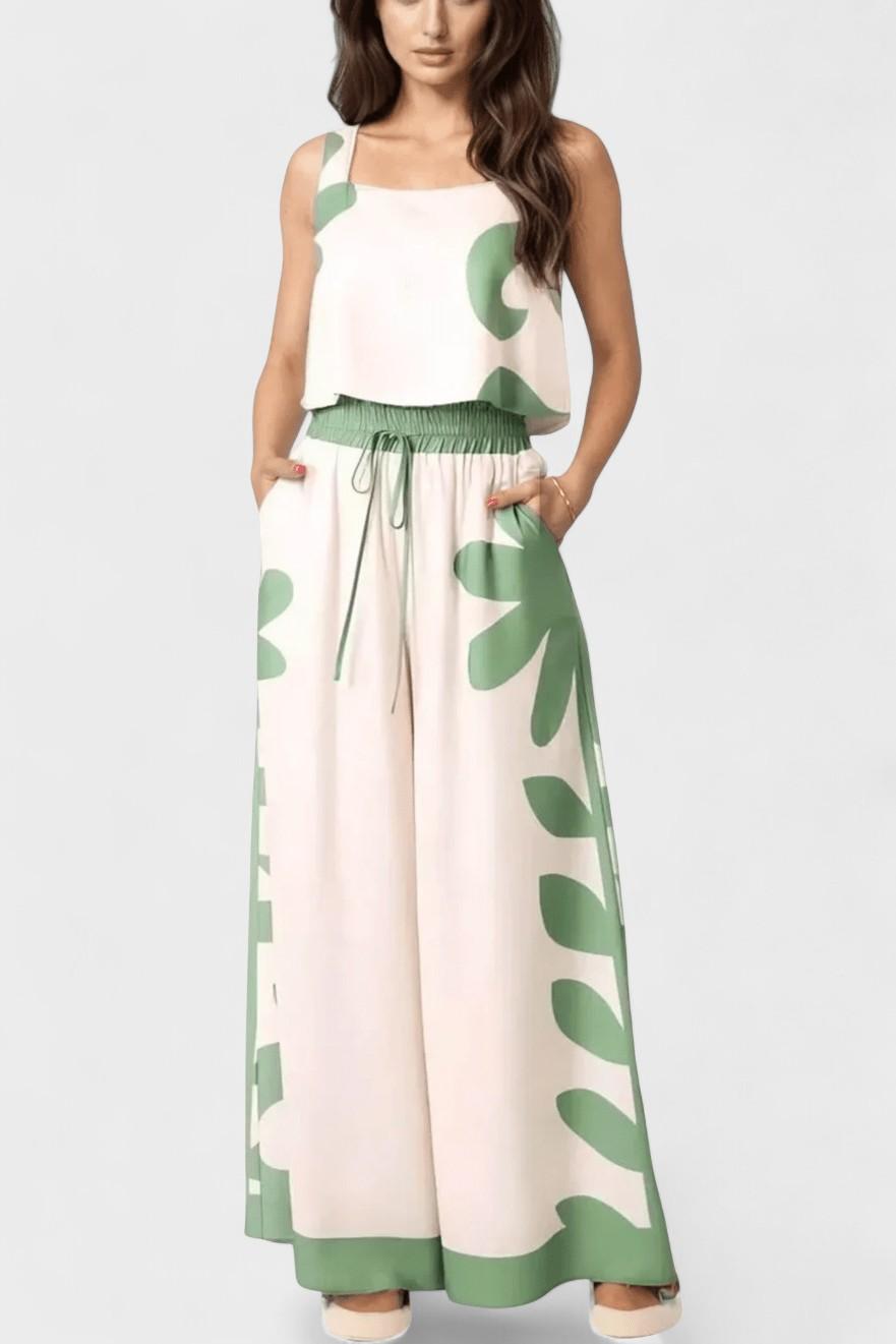 Vstupte do světa bezstarostné elegance s kompletem Serafina – tento uvolněný, ale sofistikovaný set je navržen pro svobodu a pohyb. Snadno padnoucí, bezramenný top a široké kalhoty dělají z tohoto dvoudílného outfitu lehkou a prodyšnou volbu. Sofistikovaný, folklórem inspirovaný květinový potisk vytváří vintage-romantickou atmosféru, zachycující kouzlo slunečných dní a klidných, elegantních okamžiků.