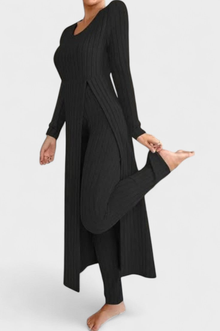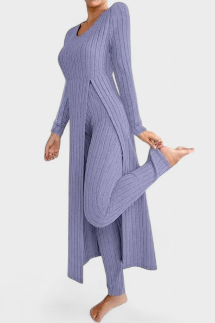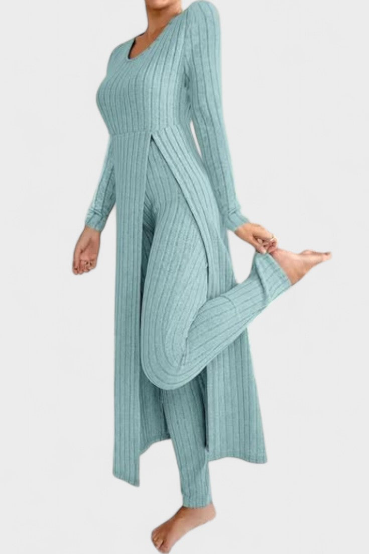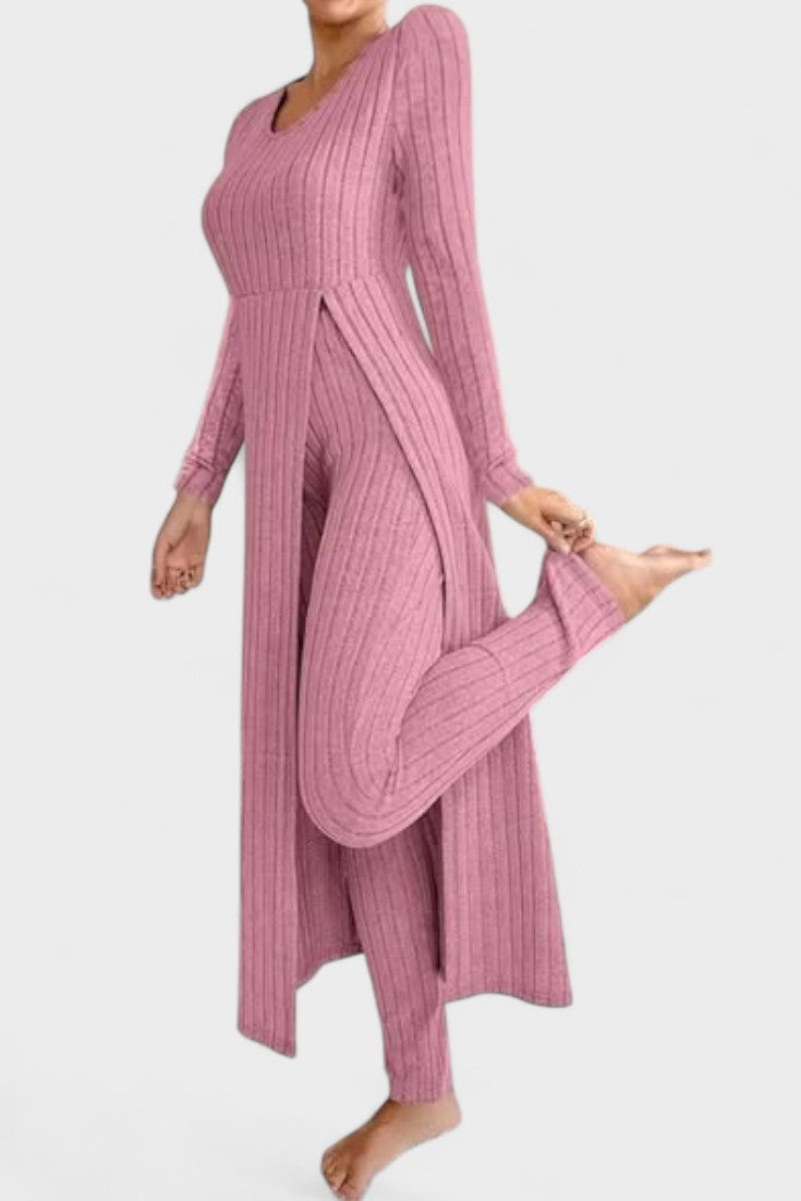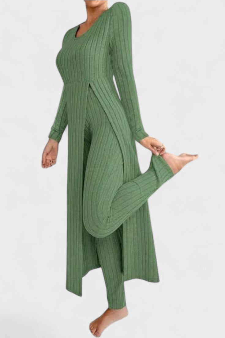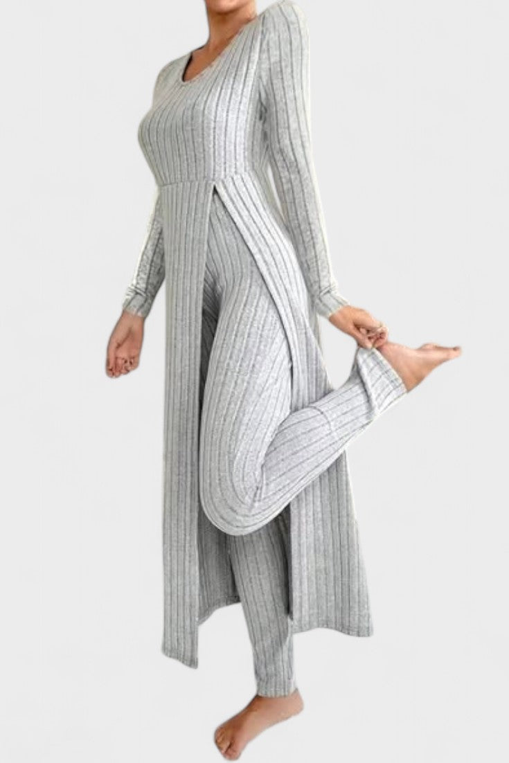 Tento nadčasový komplet představuje dokonalou rovnováhu mezi ležérním luxusem a každodenním pohodlím. Vyroben z měkké, pružné tkaniny s jemnou strukturou kanálků, dokonale se přizpůsobí vaší postavě a poskytne vám pocit volnosti a elegance v každém okamžiku dne.