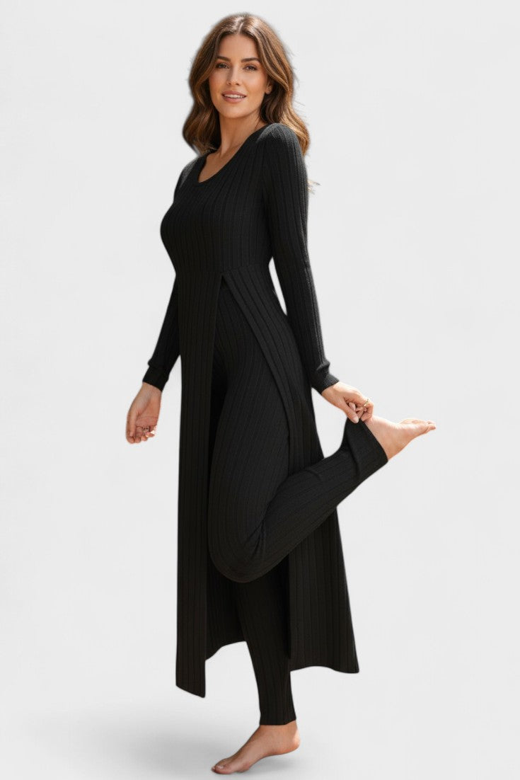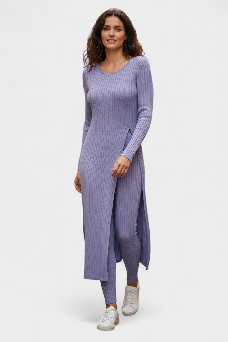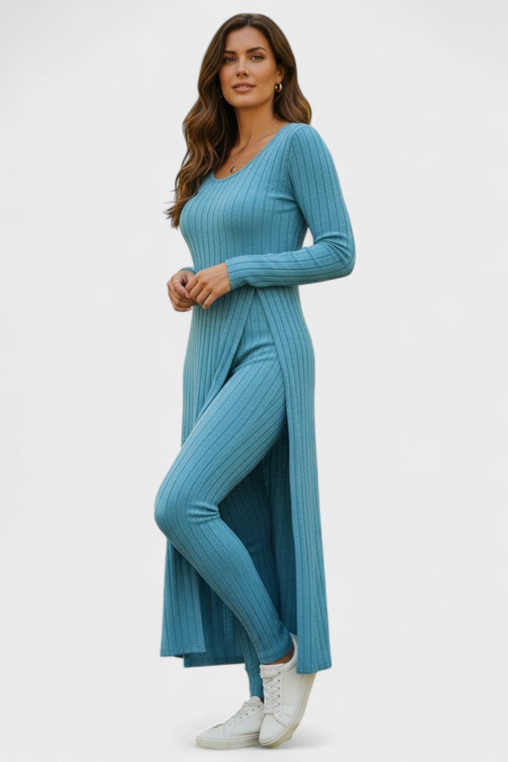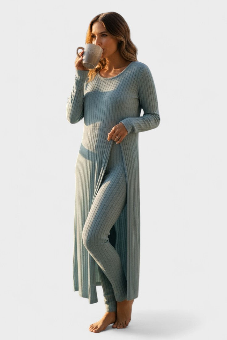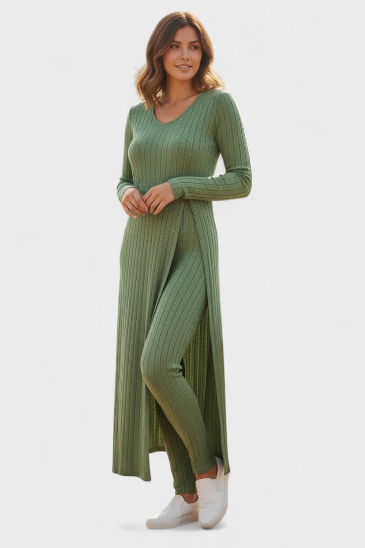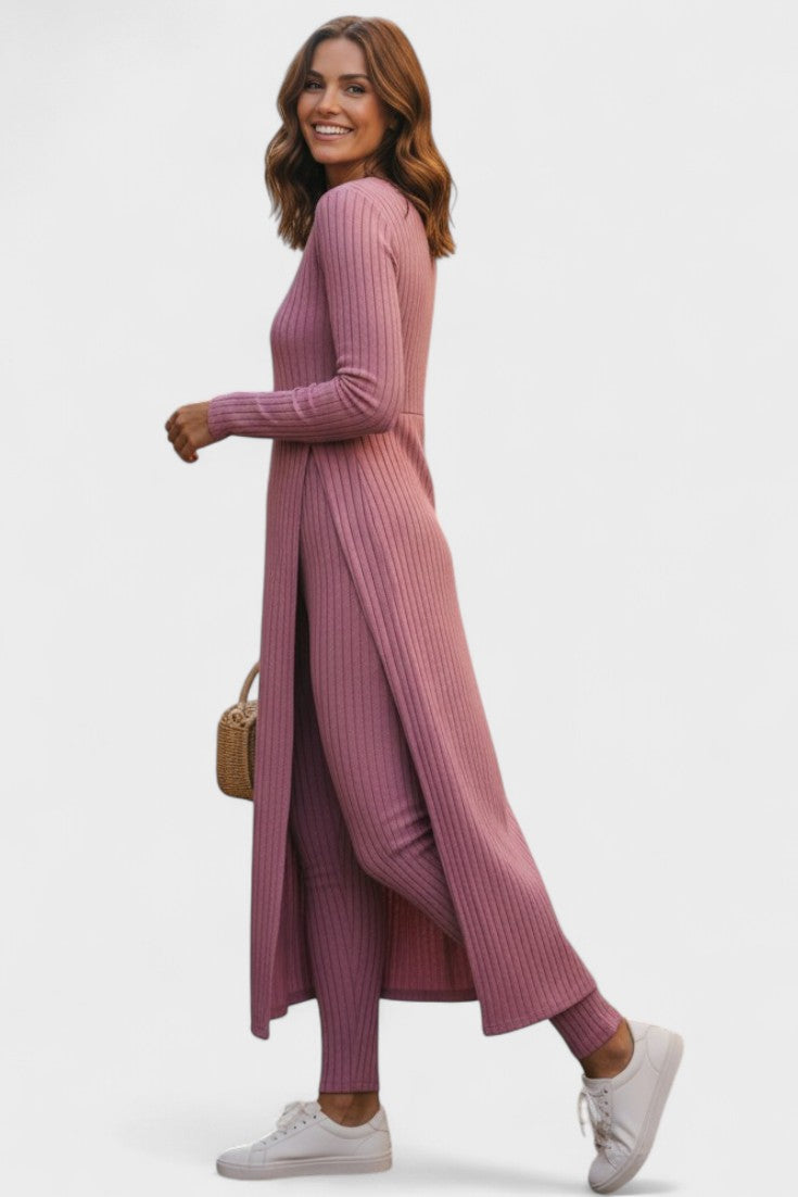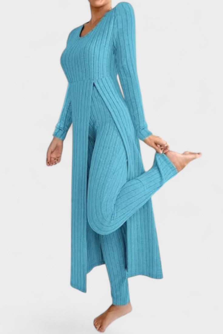 Tento nadčasový komplet představuje dokonalou rovnováhu mezi ležérním luxusem a každodenním pohodlím. Vyroben z měkké, pružné tkaniny s jemnou strukturou kanálků, dokonale se přizpůsobí vaší postavě a poskytne vám pocit volnosti a elegance v každém okamžiku dne.